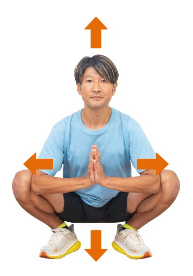 膝をつま先の方向へ開きながらお尻を落とし、肘で膝を外へ押す。そのとき、なるべく背骨を上に伸ばしておく。