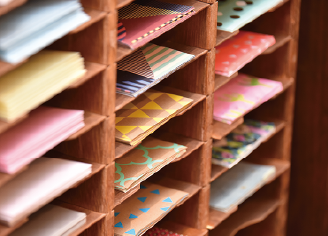 ヨーロッパから買い付けた紙を封筒サイズに合わせて断裁し、罫線を印刷。1枚1枚、柄パターンや罫線の具合が異なり、選ぶのが楽しい。