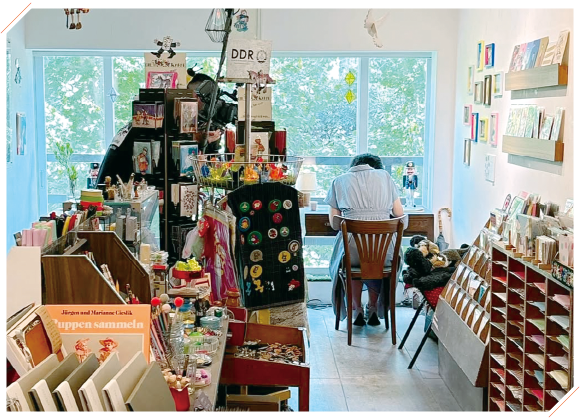 • お店のいちばん奥、公園を臨む窓辺でゆったりと手紙を書くことができる。オリジナルの紙ものや筆記具も豊富で、1通の手紙を大切にできるよう、便箋や封筒はどれも1枚しかない手作り仕立て。ヨーロッパのレトロ雑貨や文具など心くすぐられるレアものにも出会える。