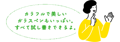 風鈴職人によって考案され、一度インクに浸すとハガキ1枚程度書けるのが特徴。試し書きできるので、滑らかな書き味をぜひ体感しよう。