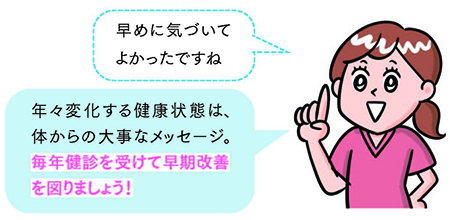簡単な生活改善だけでよくなったかもしれないのに、健診を受けず、体の変化を知らないでいたために、気づいたときには治療が必要になっていた!ということも。